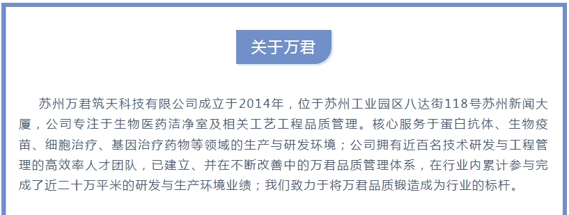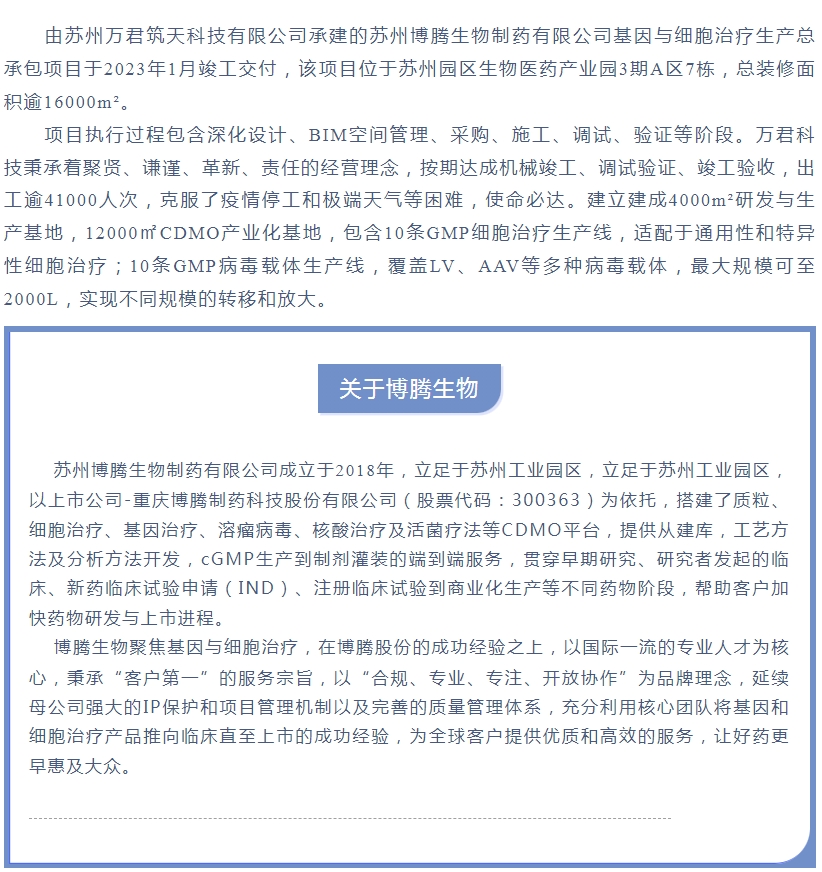 萬(wàn)君科技承建的蘇州博騰生物基因與細(xì)胞治療生產(chǎn)總承包項(xiàng)目竣工并交付客戶安全運(yùn)行100天