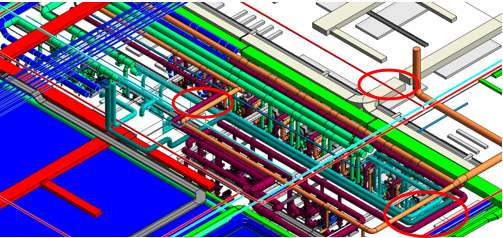 發(fā)現(xiàn)2D設(shè)計(jì)中因缺乏專(zhuān)業(yè)的空間協(xié)調(diào)人員產(chǎn)生的碰撞,規(guī)避施工過(guò)程中過(guò)多的協(xié)調(diào)工作。